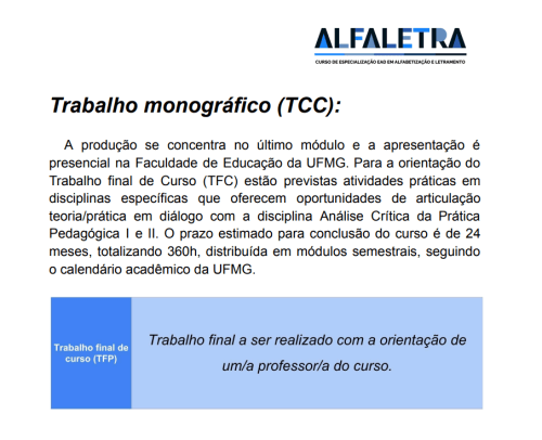- Encontros síncronos e defesa presencial do TFP (Trabalho Final de Pós);