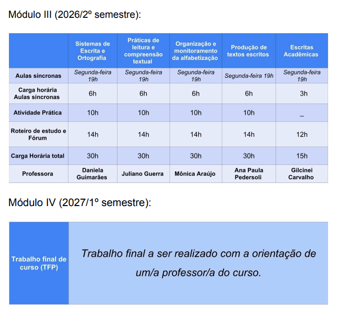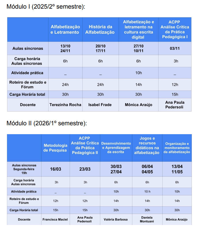 O corpo docente do curso é formado por profissionais com experiência consolidada em alfabetização, letramento, ensino fundamental e pesquisa educacional.